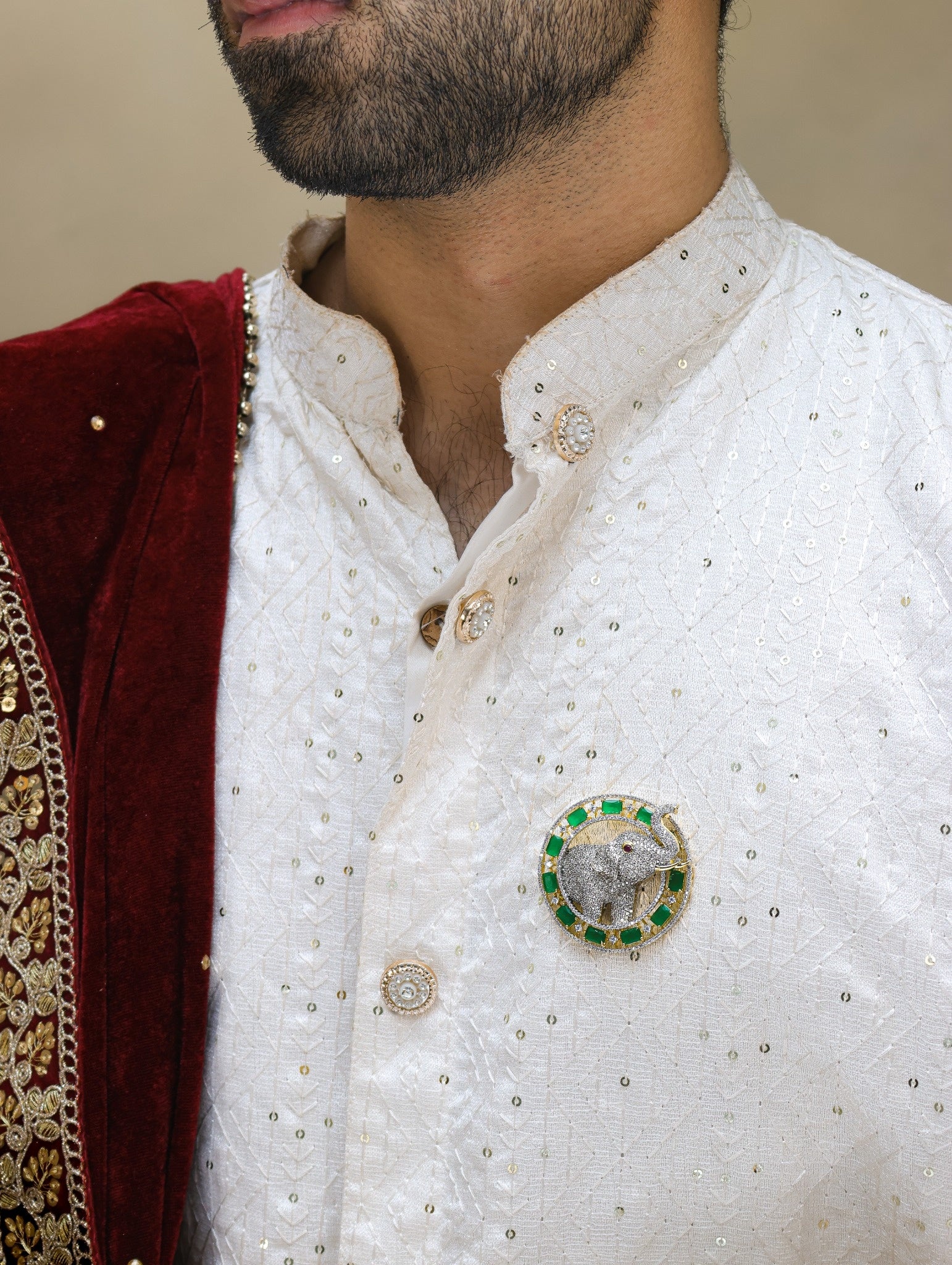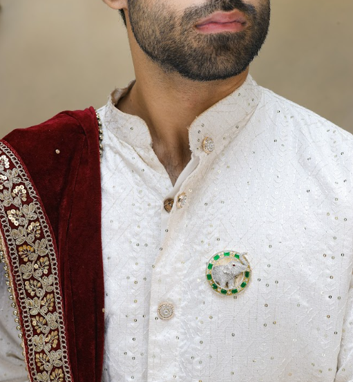 Crafted from premium brass base metal, the brooch is encrusted with shimmering zircon stones that add refined brilliance and luxury appeal. A strong concealed magnet (USP) ensures secure attachment without damaging delicate fabrics, making it ideal for sherwanis, bandhgalas, jackets, and festive wear.