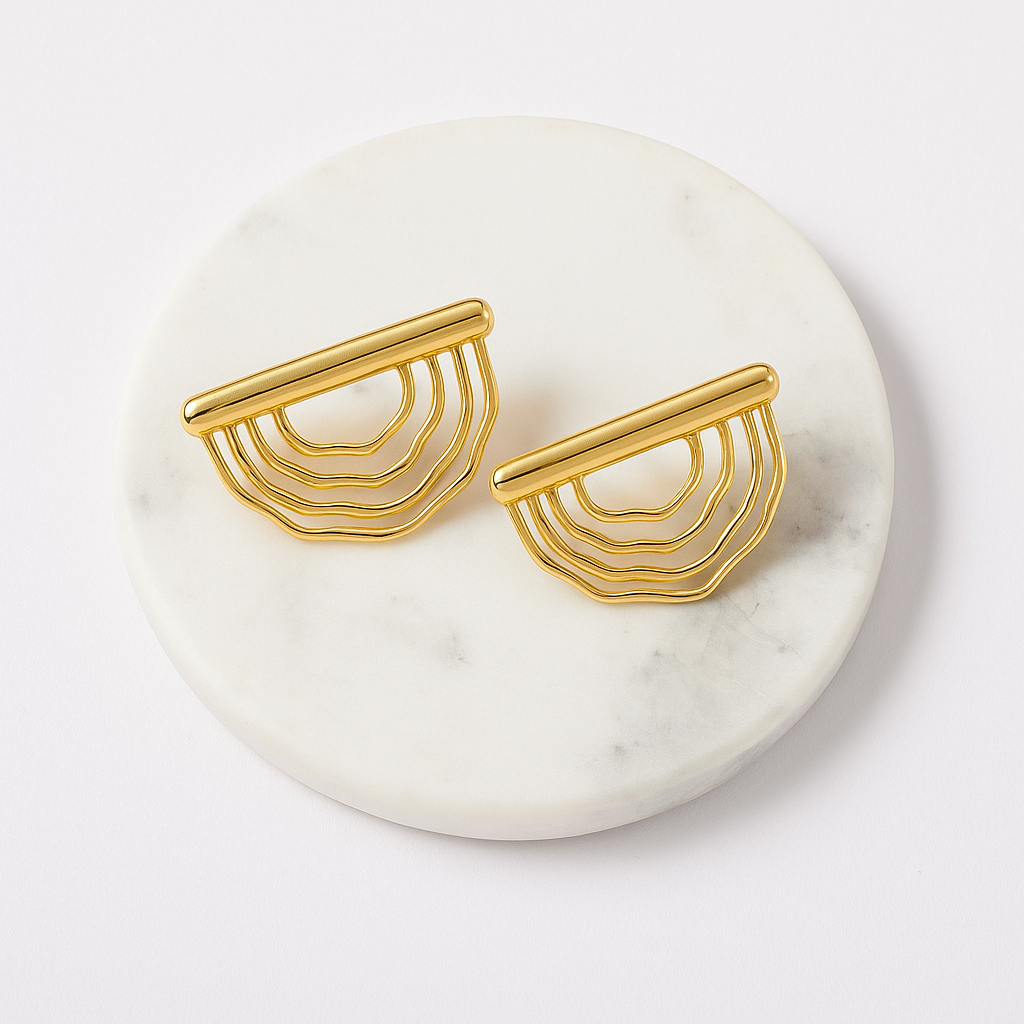 The Echo Arc Studs are a tribute to symmetry and statement. Featuring layered arcs fanning out from a polished gold bar, these earrings bring structured elegance to everyday style. Lightweight and nickel-free, they offer all-day comfort with a modern edge.